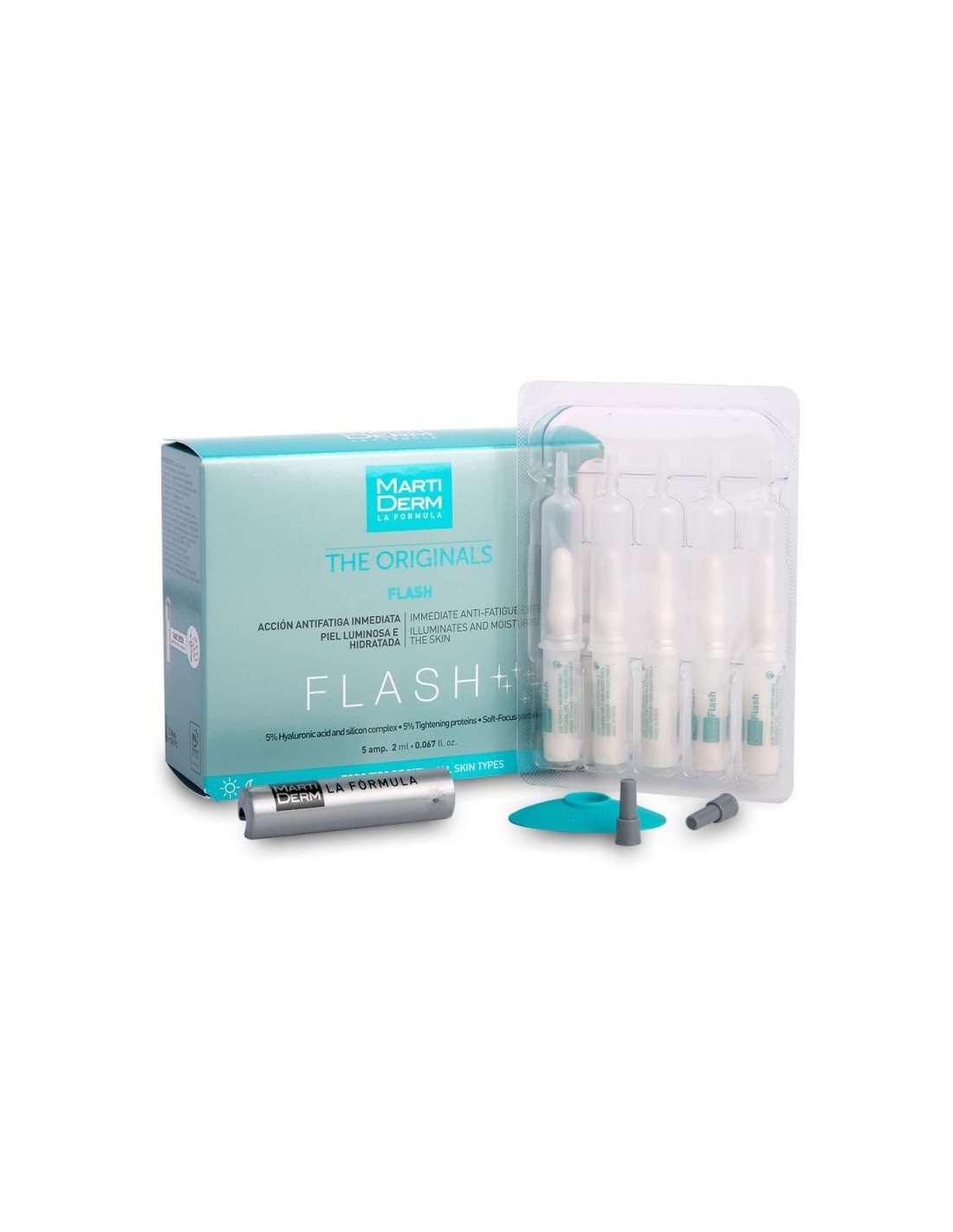 MartidermLa ampolla Flash es una fórmula creada para obtener un efecto antifatiga inmediato, ofreciendo una piel más hidratada y luminosa. No contiene ingredientes de uso restringido durante el embarazo y lactancia. En todos los casos, el médico tiene la última palabra en cuanto a las indicaciones finales de uso.