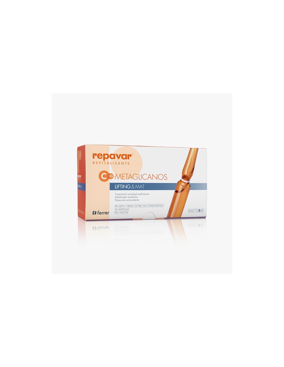 Repavar Revitalizante Metaglicanos Lifting&Mat 30 Ampollas. Tratamiento intensivo antiedad específico para la piel mixta. Tratamiento diario único que actua desde el interior de la dermis, activando la sintesis de los componentes fundamentales de la piel, para un mayor sustento y firmeza en la piel. Con 5,5% de Vitamina C pura, y metaglicanos antiedad, previene la formación de radicales libres debidos a la radiación solar y la polución y ayuda a reducir arrugas y perdida de firmeza. Gracias a su formulación especifica para piel mixta, ayuda a reducir el numero y el tamaño de los poros, disminuyendo los brillos de la piel.