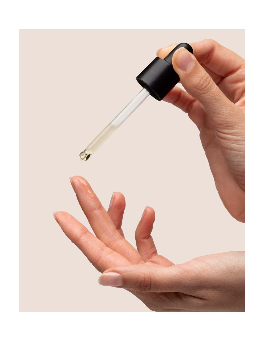 Tomar unas gotas y aplicarlo de medio rostro hasta el mentón, de adentro hacia afuera con pequeños toques.