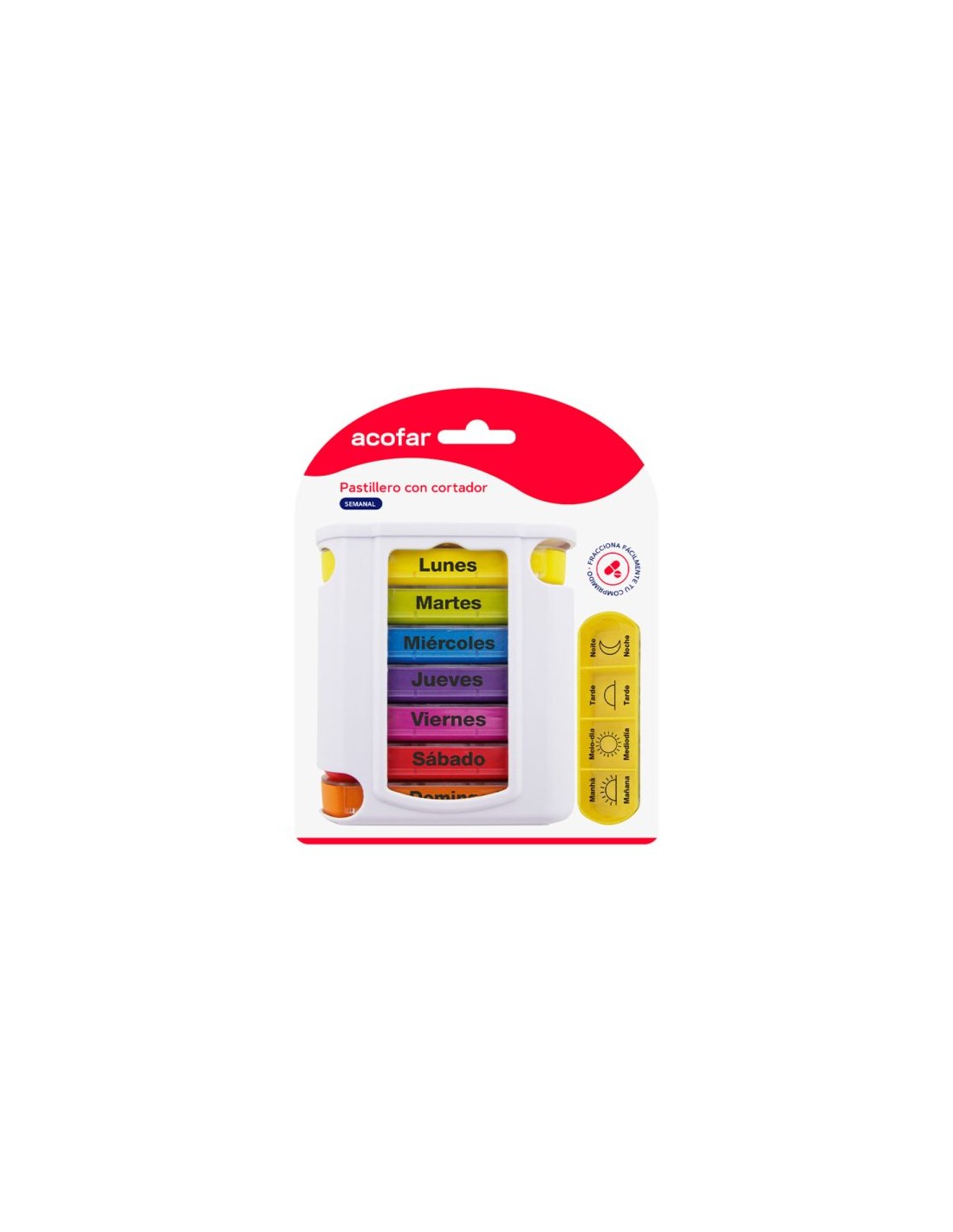 ACOFAR PASTILLERO SEMANAL CON CORTADOR es un producto que combina la funcionalidad de un pastillero semanal con la conveniencia de un cortador de comprimidos.