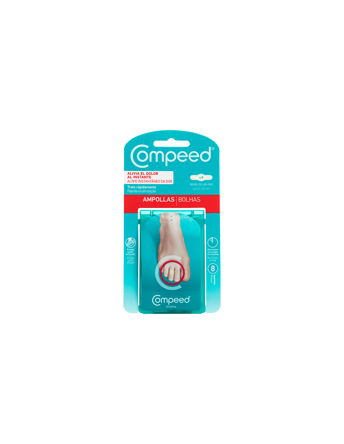 Compeed Ampollas Dedos Pies 8 Unidades son apósitos hidrocoloides que se aplican directamente sobre las ampollas de los dedos de los pies para protegerlas. Están diseñados para aliviar el dolor de las ampollas, protegerlas de la presión y la rozadura, y mejorar la cicatrización de la herida
