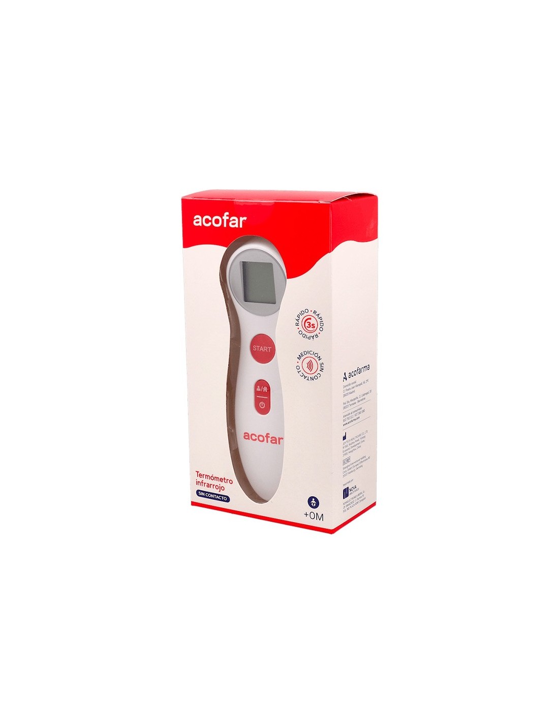 El termómetro infrarrojo sin contacto de Acofar es un termómetro de alta precisión que mide la temperatura corporal humana detectando la intensidad de la luz infrarroja emitida por la frente. Es un termómetro de uso doméstico que no requiere contacto, ya que se coloca a 2 o 3 centímetros del área. El termómetro presenta los resultados en una pantalla LCD en 3 segundos.