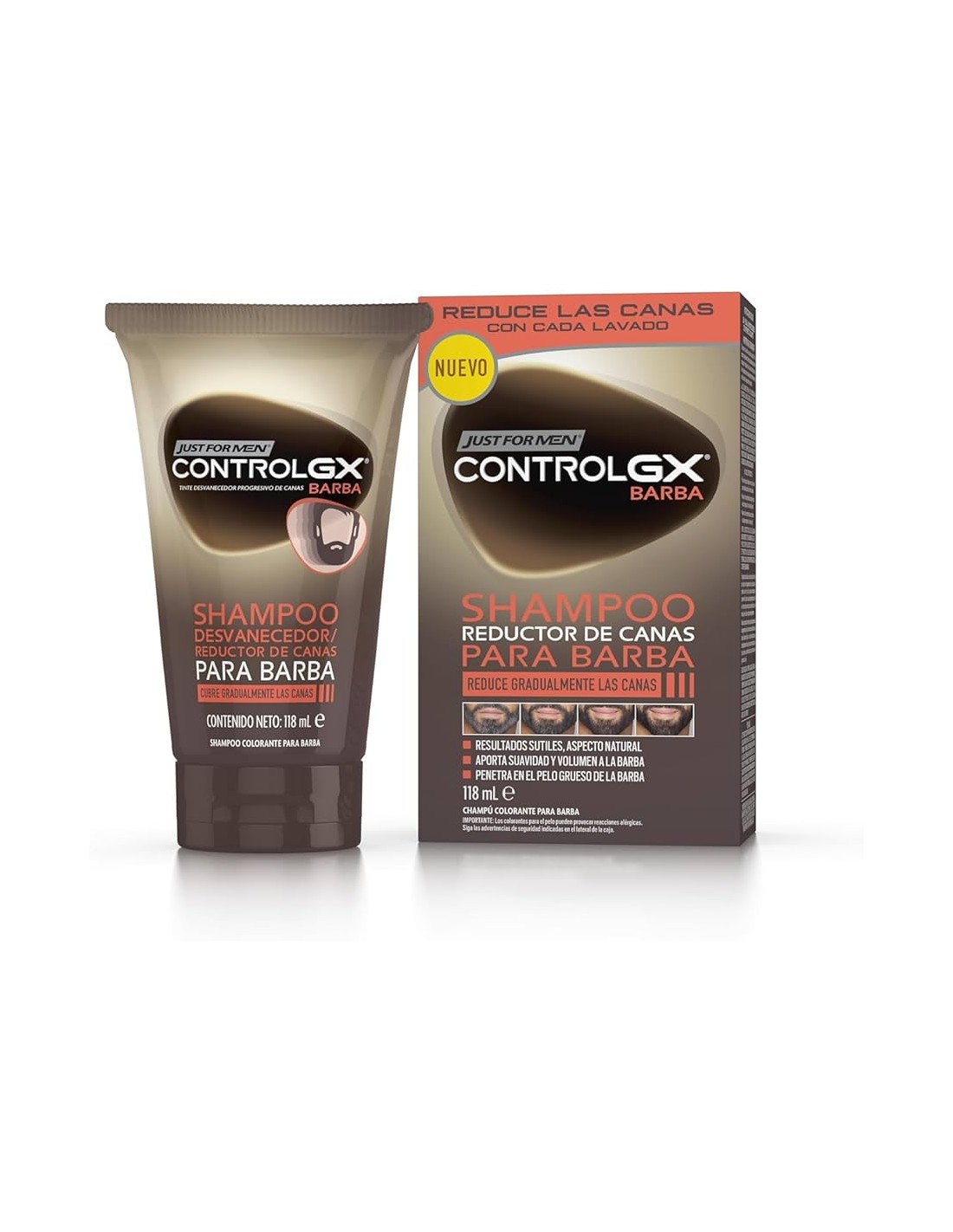 - Just For Men Control Gx Barba Champú colorante de 118 ml con fórmula innovadora, reduce las canas de la barba gradualmente con cada lavado.
