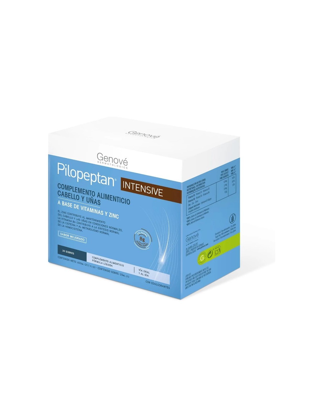PILOPEPTAN INTENSIVE 30 SOBRES CAB-UÑAS es un producto diseñado para mejorar la salud del cabello y las uñas. Viene en forma de sobres bebibles y contiene ingredientes como colágeno hidrolizado, vitaminas B5 y B6, y zinc.