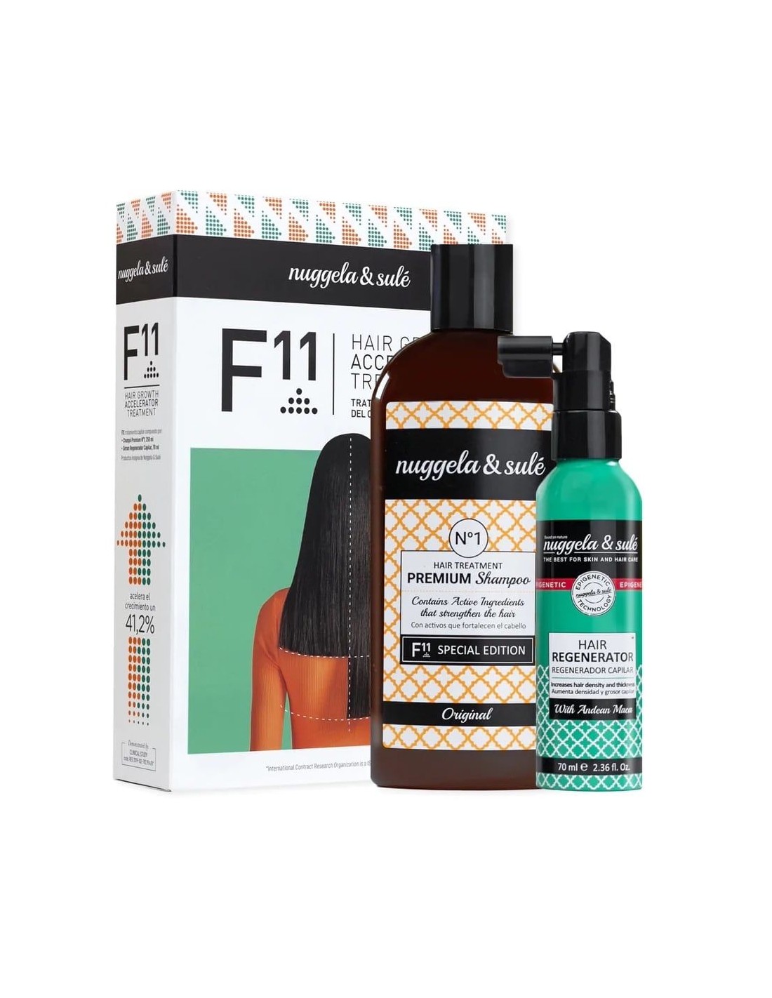 El Tratamiento F11 Nuggela & Sulé Pack 250 ml+ es un conjunto de productos diseñados para lograr un cabello más largo y grueso. Este pack incluye el Champú Premium Nº1 Edición Especial de 250 ml y el Sérum Regenerador de 70 ml.
