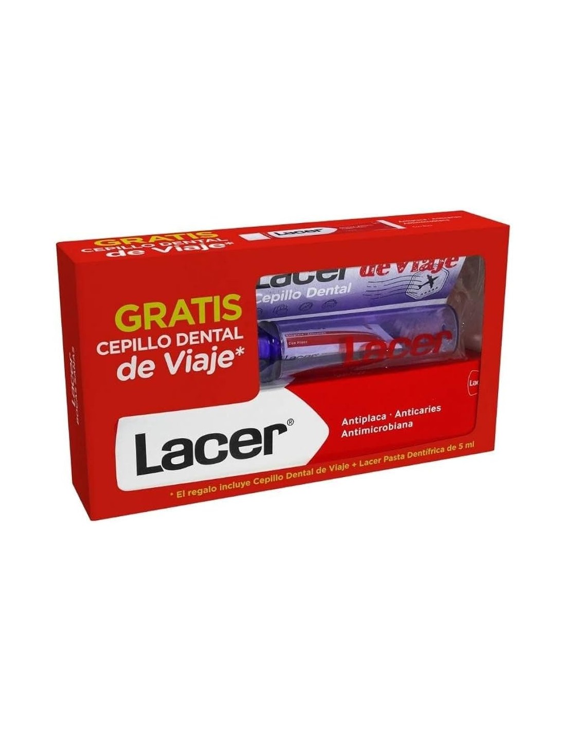 El cepillo dental de viaje Lacer es una opción ideal para mantener una buena higiene bucal cuando viajas. Tiene un cabezal de tamaño pequeño que es adecuado para la mayoría de las bocas adultas, y cerdas de dureza media, lo que las hace eficaces para eliminar la placa y los restos de comida, pero suaves con las encías. El mango del cepillo es ergonómico y tiene estrías antideslizantes para facilitar su uso.