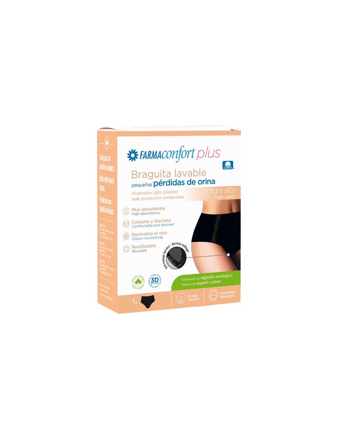La braguita cintura alta para pequeñas pérdidas de orina está fabricada con algodón ecológico certificado.