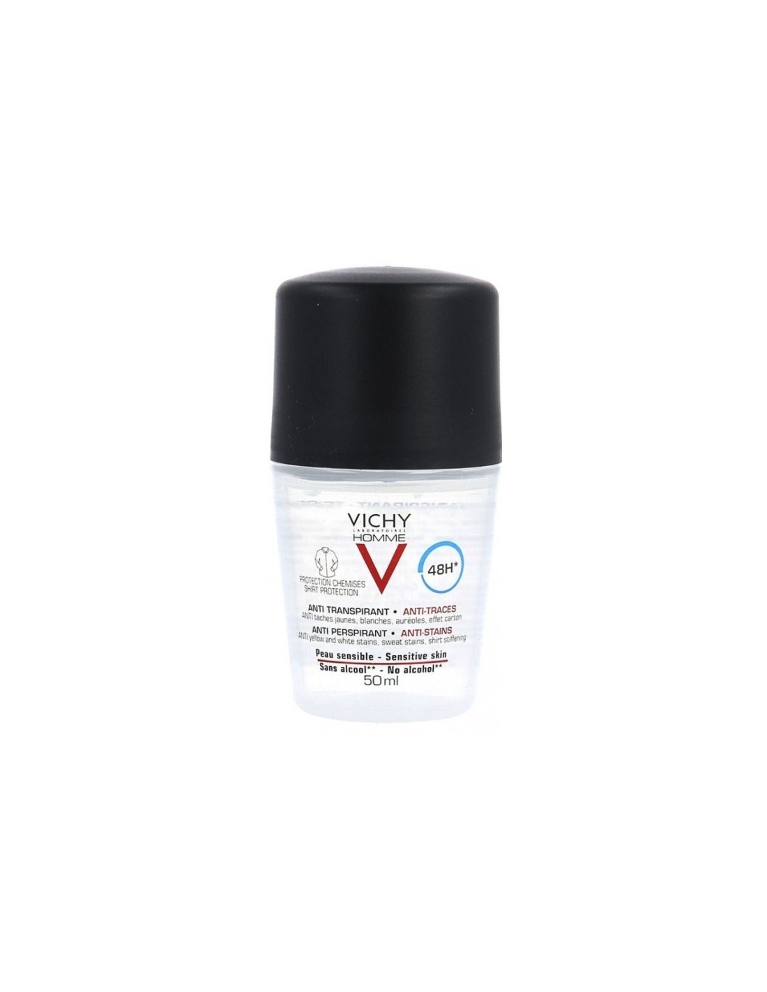 VichyAnti-transpirante 48h. Anti-manchas. Para hombres con la piel sensible. Hipoalergénico. Fórmula transparente con tecnología "protección de camisa" anti-marcas amarillas o blancas, anti-manchas de sudor