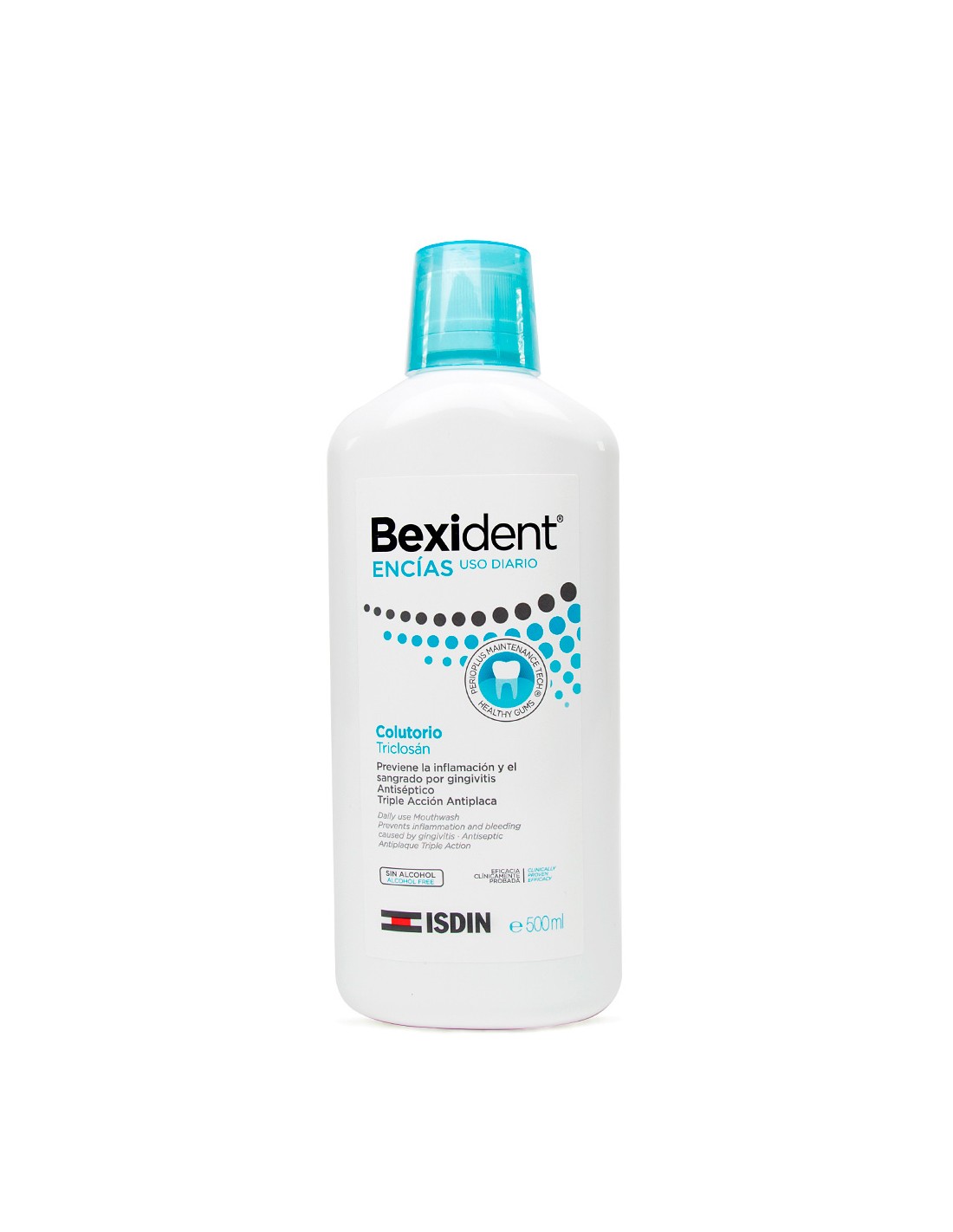 El colutorio Bexident Encías Tric 500ml es un enjuague bucal con triclosán que ayuda a prevenir la gingivitis y periodontitis. También contiene dexpantenol, que ayuda a reducir la inflamación y promover la cicatrización de las encías.