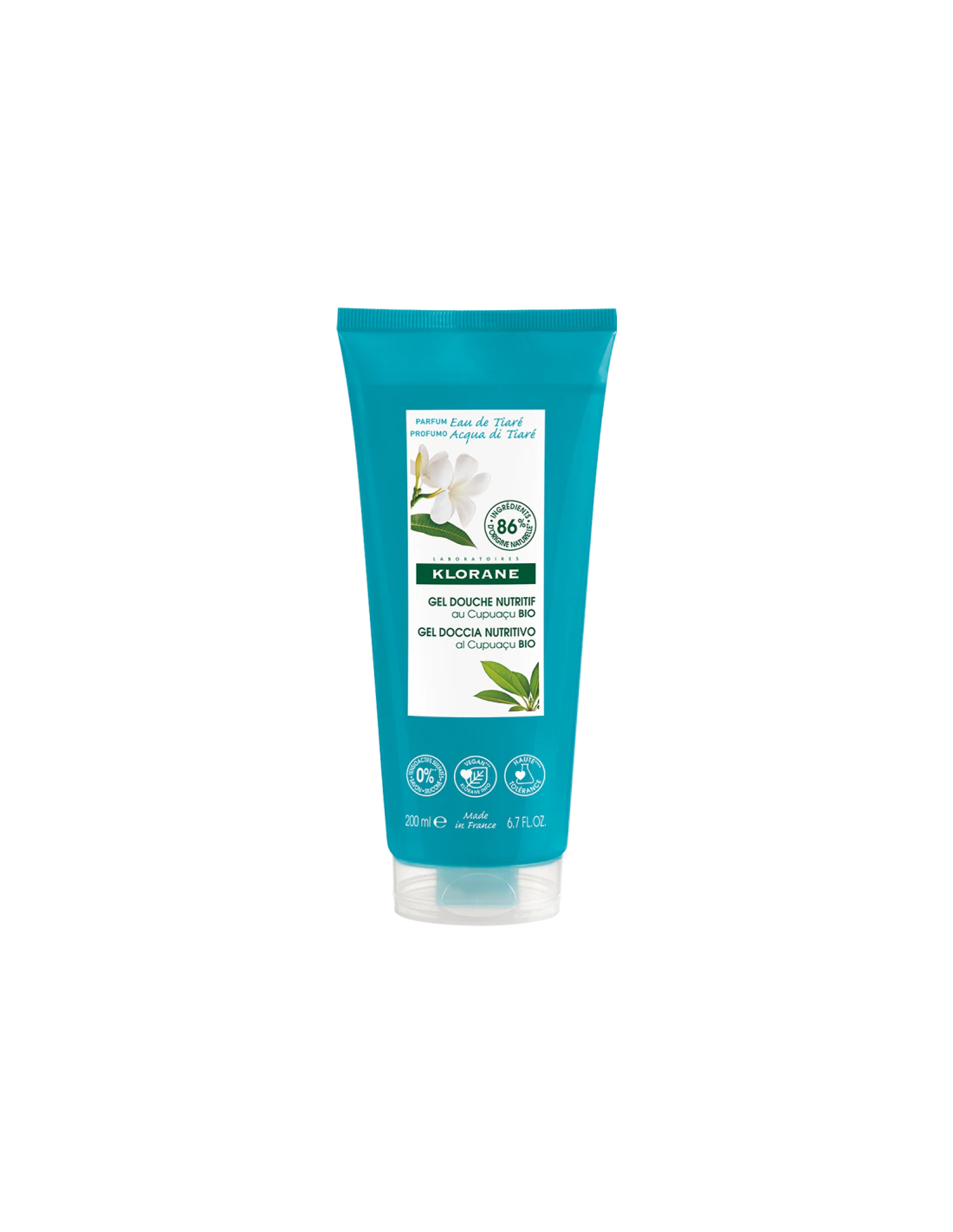 KloraneEl gel de ducha agua de tiare a la manteca de cupuaçu orgánica limpia suavemente la piel y respeta su equilibrio con una fragancia agradable y revitalizante.