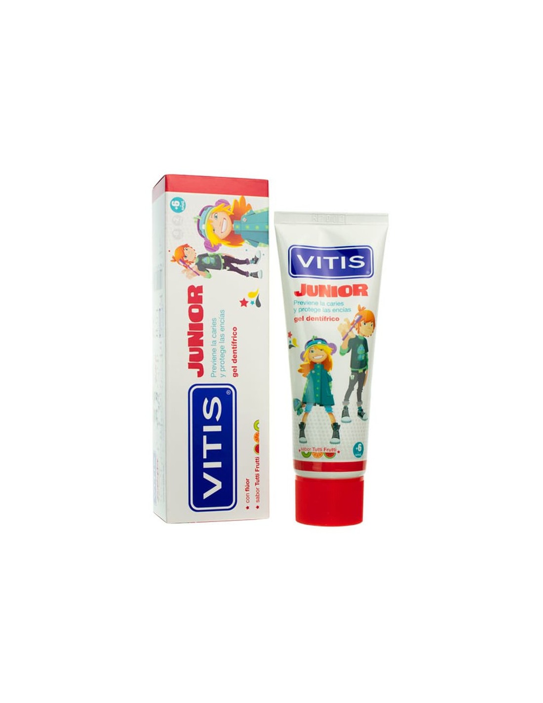 VITIS JUNIOR GEL DENT 75ML es una pasta de dientes para niños de 6 a 12 años que ayuda a prevenir la caries dental, reducir la formación de placa bacteriana y proteger las encías