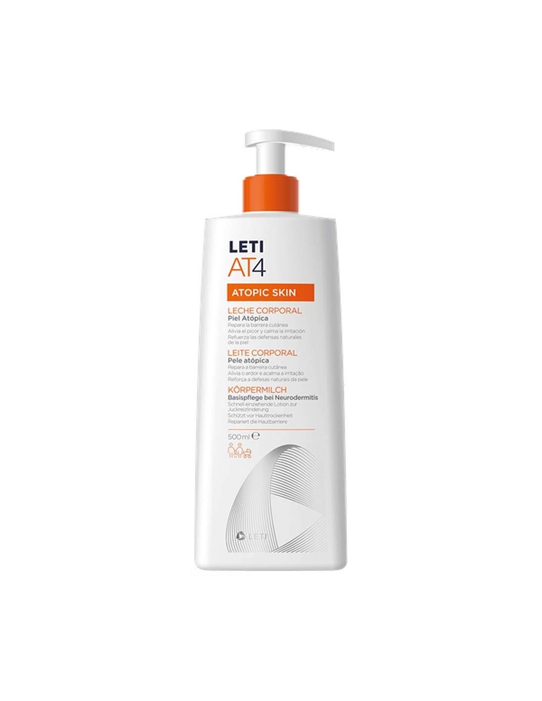 - Aplicar Leti AT4 Leche Corporal sobre la piel limpia y seca después del baño o ducha.