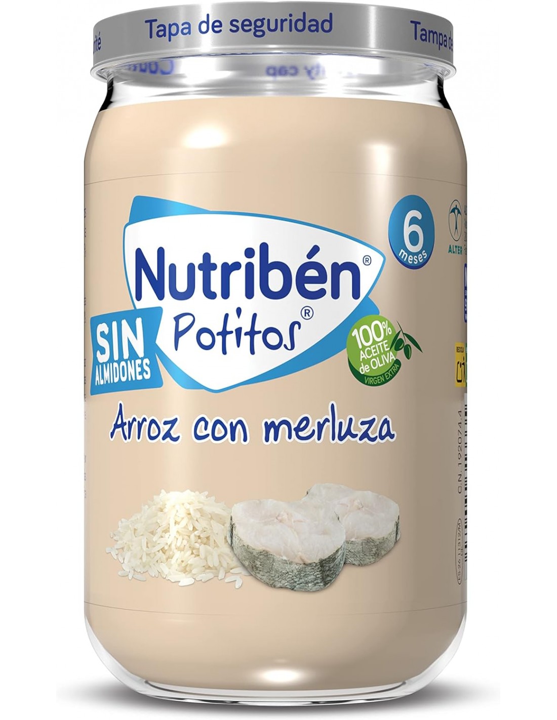 Potito de comida infantil a base de merluza, verduras y aceite de oliva virgen extra,
