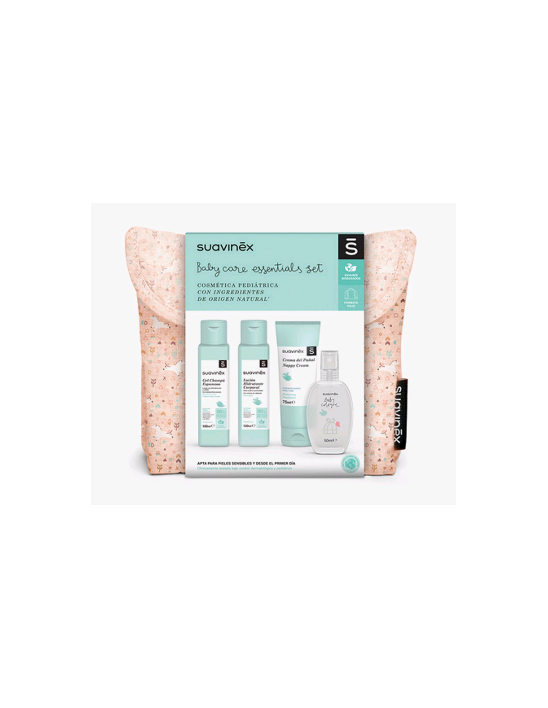 El Neceser Viaje Tela Rosa de Suavinex Cosm es un kit de viaje perfecto para cuidar la piel de tu bebé mientras estás fuera de casa. Contiene productos esenciales para la higiene y el cuidado del bebé, todos ellos formulados con ingredientes naturales y dermatológicamente testados para garantizar la máxima seguridad y suavidad en la piel del bebé.