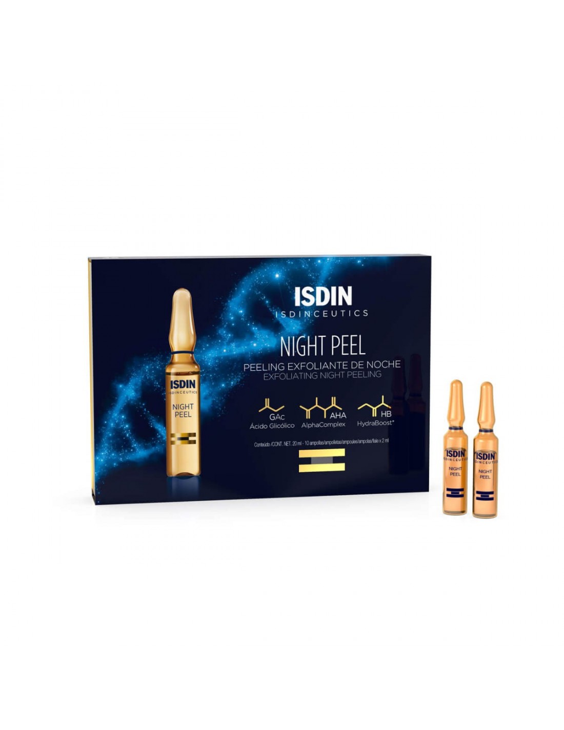 Solución facial en ampollas con una combinación de alfa-hidroxiácidos que aporta un efecto peeling, renovando la textura de la piel y atenuando imperfecciones y líneas de expresión