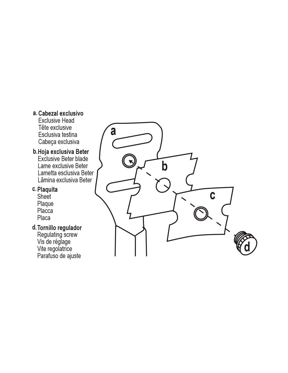 BeterDispone de un cabezal exclusivo que incluye un tornillo regulador del grosor del corte y le confiere la máxima eficacia seguridad y comodidad. Utilizar sólo con las hojas de recambio exclusivas Beter.