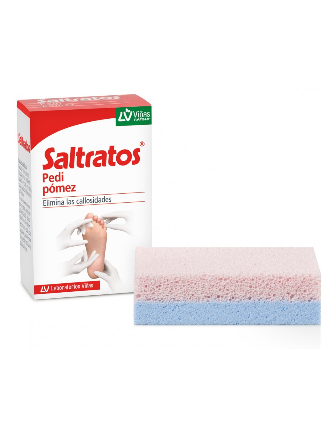 Saltratos Pedi Pómez es una pieza de vidrio poroso tratada con un acabado especial en cada una de las caras para complementar su función. La cara rosa es de poro ancho y duro, para una primera acción rápida sobre las callosidades. La cara azul es de poro pequeño, para eliminar después los residuos y suavizar la piel.