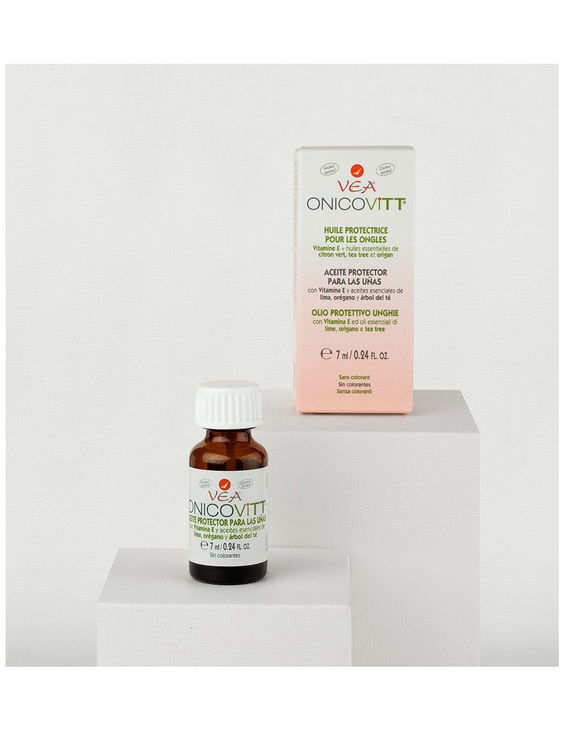 VEA ONICOVITT es un aceite innovador para el bienestar de las uñas constituido por Vitamina E, antioxidante, y por una mezcla patentada de aceites esenciales (lima, orégano, árbol del té) que favorecen la acción antimicrobiana. No contiene colorantes. Además, no contiene agua y por lo tanto no puede ser colonizado por microorganismos.