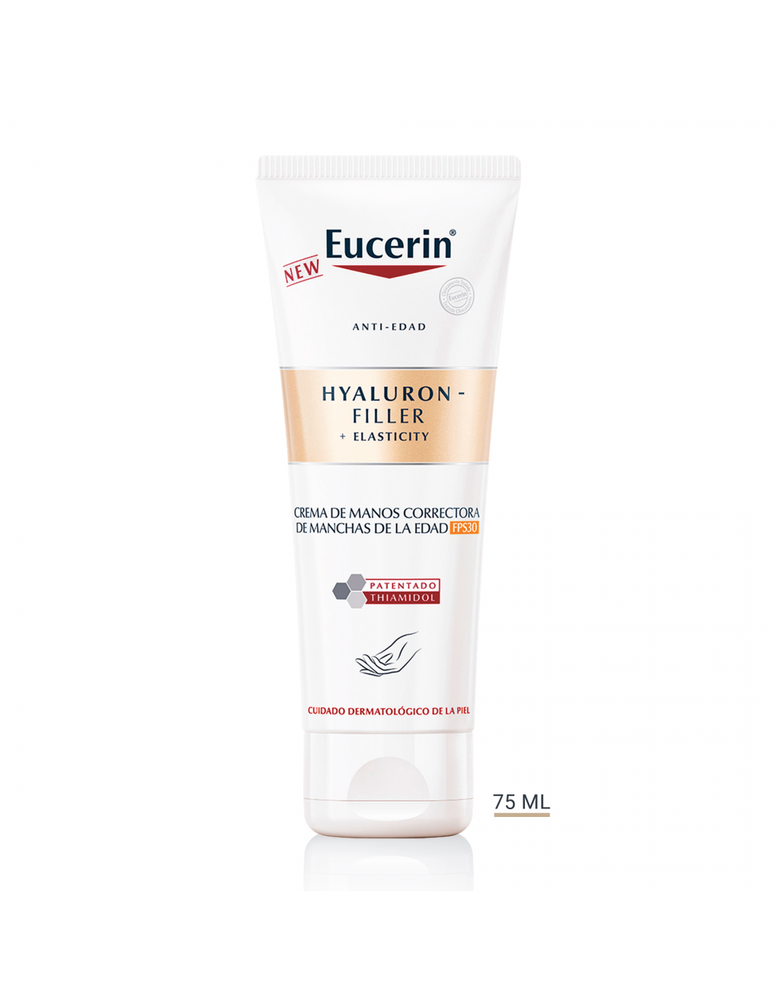 Eucerin Hyaluron-Filler + Elasticity Crema de manos correctora de manchas de la edad se ha elaborado con una fórmula única que ofrece varios beneficios antiedad. La combinación innovadora de Eucerin de Ácido Hialurónico de alto y bajo peso molecular rellena visiblemente las arrugas profundas y actúa junto a la Arctiina, un activo que acelera la renovación del colágeno en las células de la piel. También contiene Thiamidol, un principio activo eficaz y patentado que actúa en el origen de la hiperpigmentación reduciendo la producción de melanina. Se ha demostrado clínica y dermatológicamente que reduce las manchas de hiperpigmentación y evita su reaparición. Los primeros resultados son visibles después de dos semanas y mejoran continuamente con el uso regular.