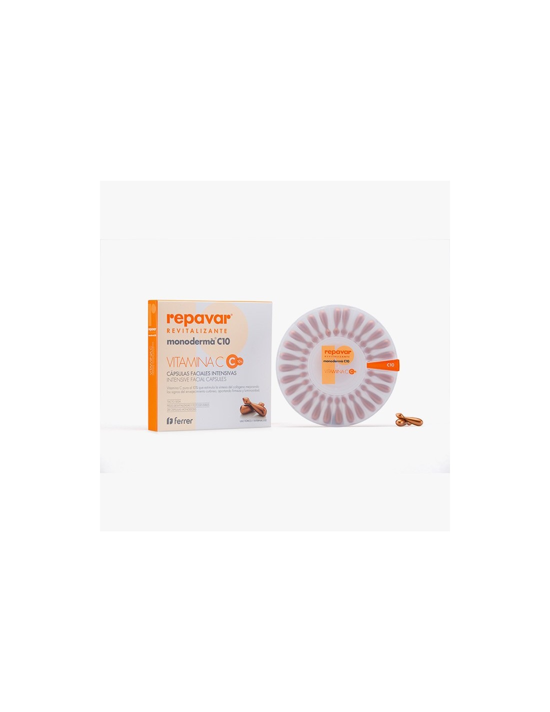 RepavarLas Cápsulas Faciales Intensivas de Repavar, gracia a su alto contenido en Vitamina C Pura (10 %), son un tratamiento intensivo antimanchas y antiedad que reduce la formación de melanina y estimula la síntesis de colágeno. Repara los signos del envejecimiento cutáneo como manchas y arrugas, reduce la flacidez y aporta luminosidad. Eficacia clínicamente demostrada.