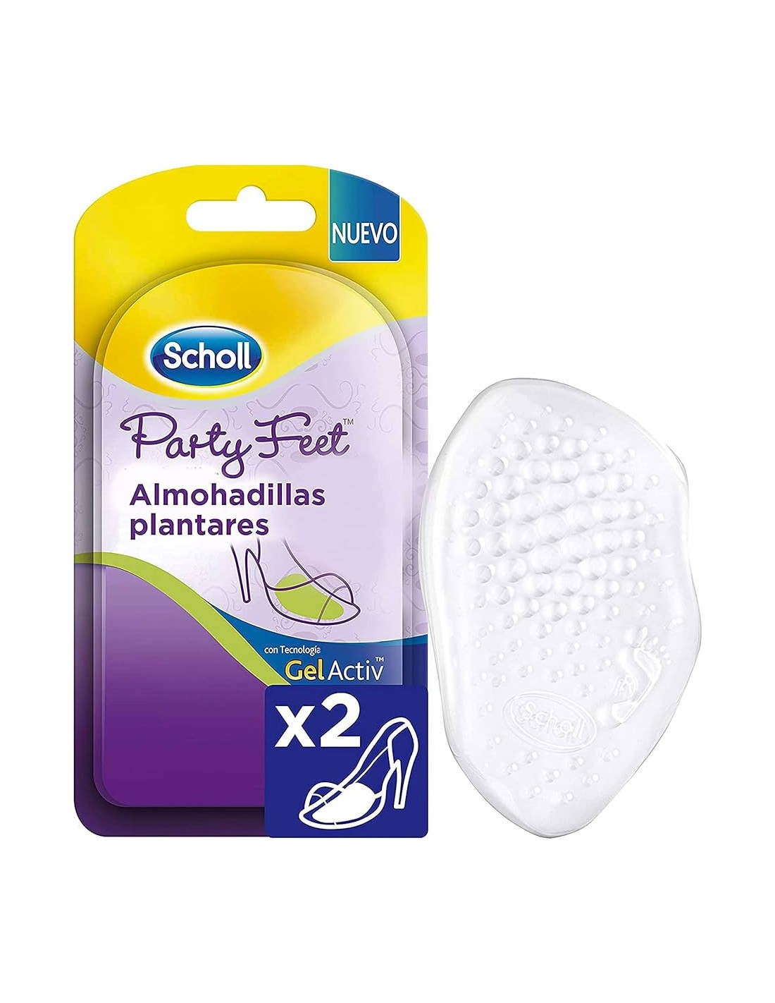 Dr. Scholl Party Feet Almohadilla Antepie es una plantilla de gel suave y discreta diseñada para proteger y aliviar el antepié del dolor y la presión causados por tacones altos, zapatos ajustados o actividades prolongadas de pie.