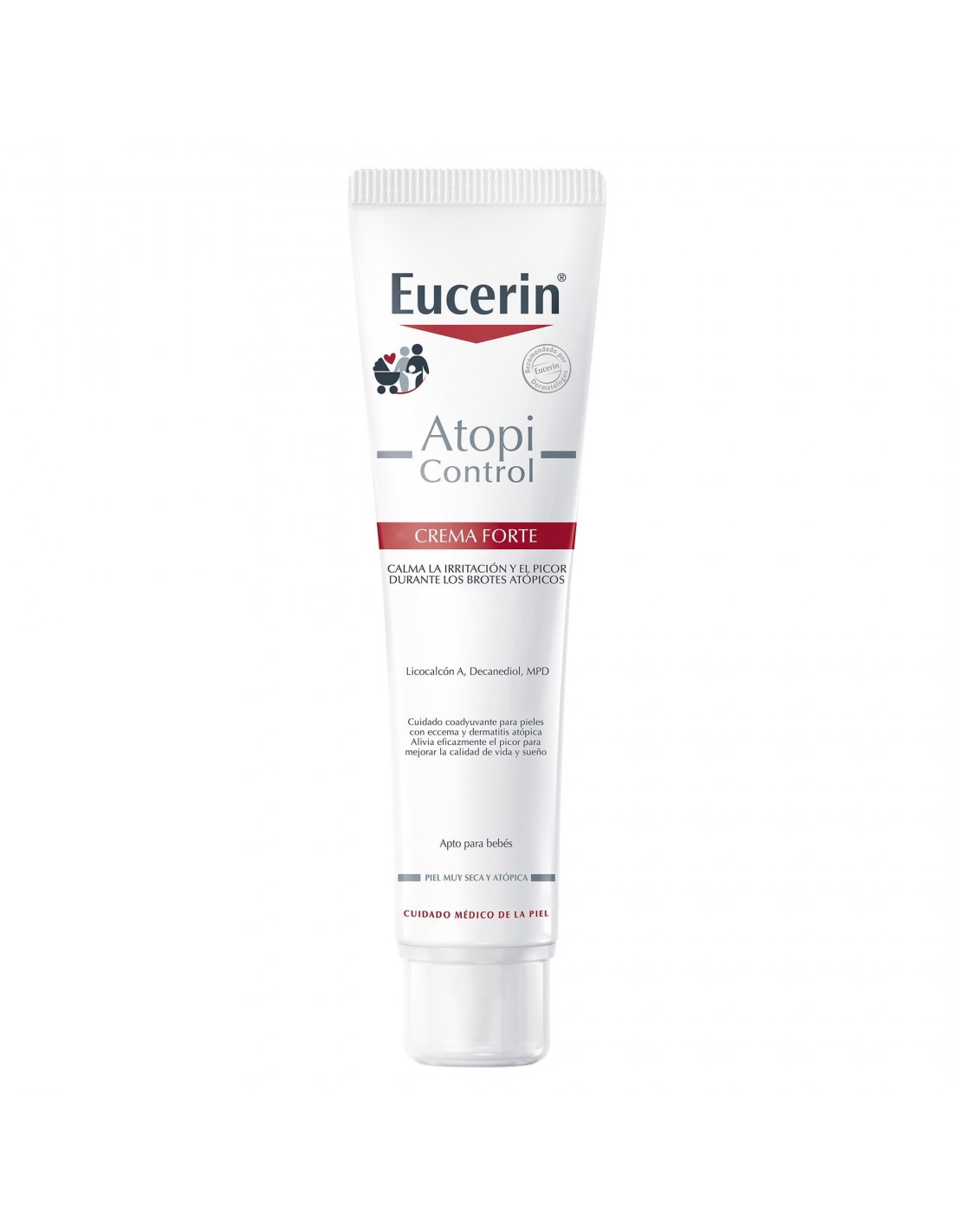 Aplicar con tanta frecuencia como sea necesario sobre las áreas afectadas para realizar un cuidado intensivo de la piel, para calmarla y suavizarla. La crema Eucerin AtopiControl Crema Forte es un complejo único que incluye los ácidos grasos omega 6, de acción regenerante, (aceite de onagra y aceite de semilla de uva), calmante licocalcón A (un extracto de la raíz de la regaliz), el decandiol antibacteriano y el refrescante mentoxipropanediol. Se ha probado clínica y dermatológicamente en su compatibilidad con la piel atópica de los adultos, los niños y los bebés a partir de las cuatro semanas.