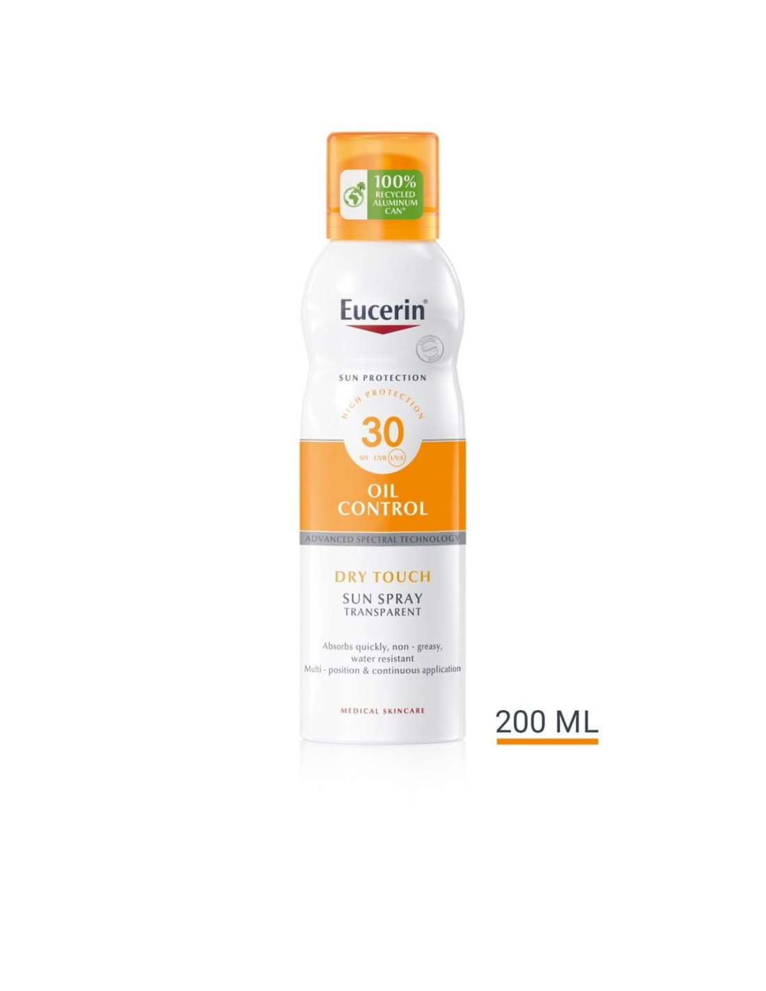Eucerin Sun Spray Transparent Dry Touch Sensitive Protect FPS 30 es un protector solar corporal en aerosol apto para piel sensible, incluyendo la piel con tendencia acneica. La Advanced Spectral Technology combina filtros fotoestables y de amplio espectro frente a rayos UVA y UVB (1). Ofrece una protección alta contra los rayos UV con licocalcón A para neutralizar los radicales libres producidos por la luz UV y HEVL.