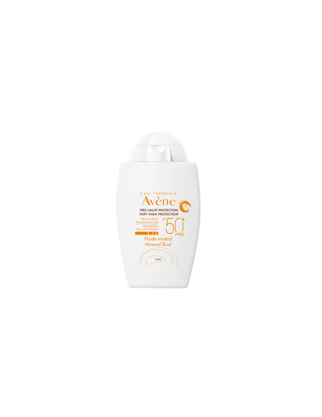 AveneProtección solar muy alta, 100% mineral, textura fluida y ligera para las pieles más intolerantes a los filtros químicos y los perfumes.