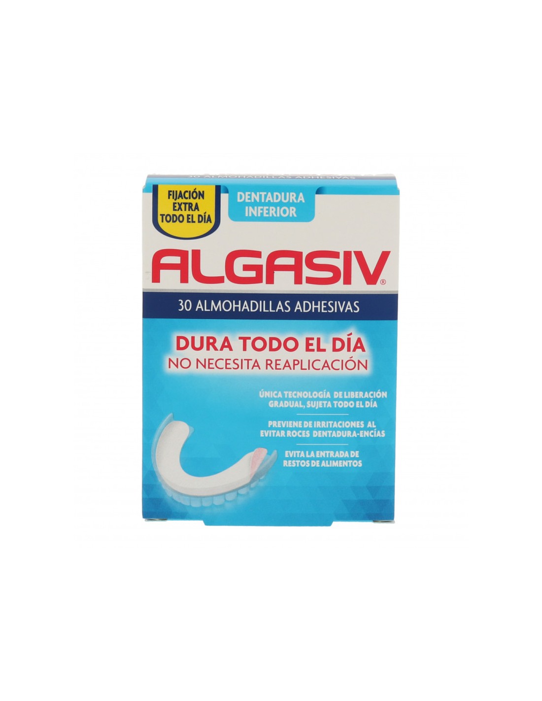 Algasiv Almohadillas Dentales Inferior 30 Unidades son almohadillas adhesivas para dentaduras postizas que ayudan a fijar la dentadura a la encía y evitan que se mueva. Están indicadas específicamente para dentaduras postizas inferiores.