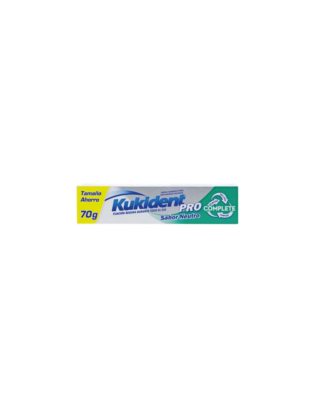Kukident Pro Complete Neutro 70 gr es una crema adhesiva para prótesis dentales que ayuda a mantener las prótesis dentales completas o parciales en su lugar durante todo el día. Es una crema adhesiva sin sabor y sin olor que no irrita las encías.