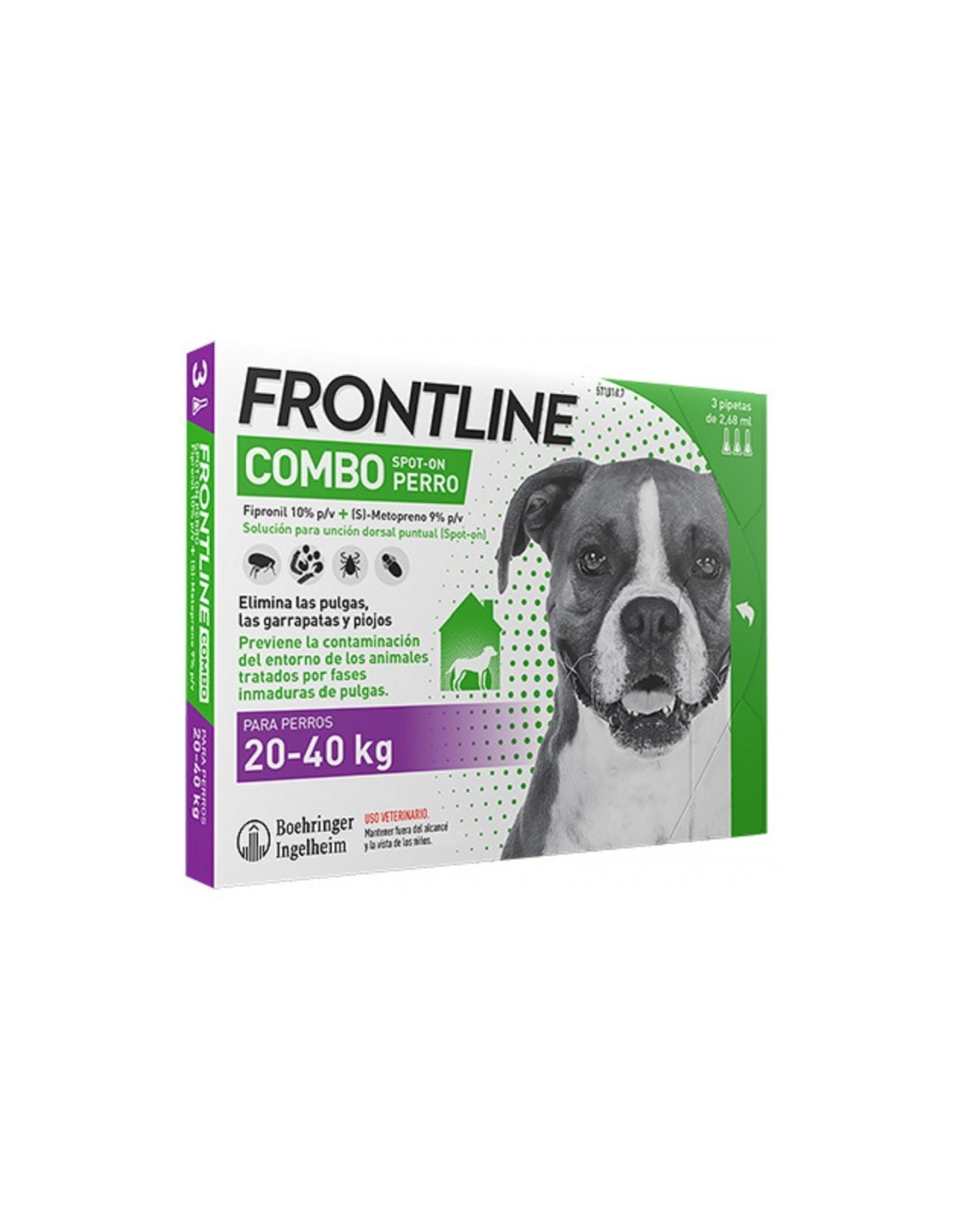 FRONTLINE COMBO PERR 20/40K 3P es un tratamiento antiparasitario externo para perros de entre 20 y 40 kg de peso que elimina pulgas, garrapatas y piojos. Es una solución tópica que se aplica directamente sobre la piel del perro.