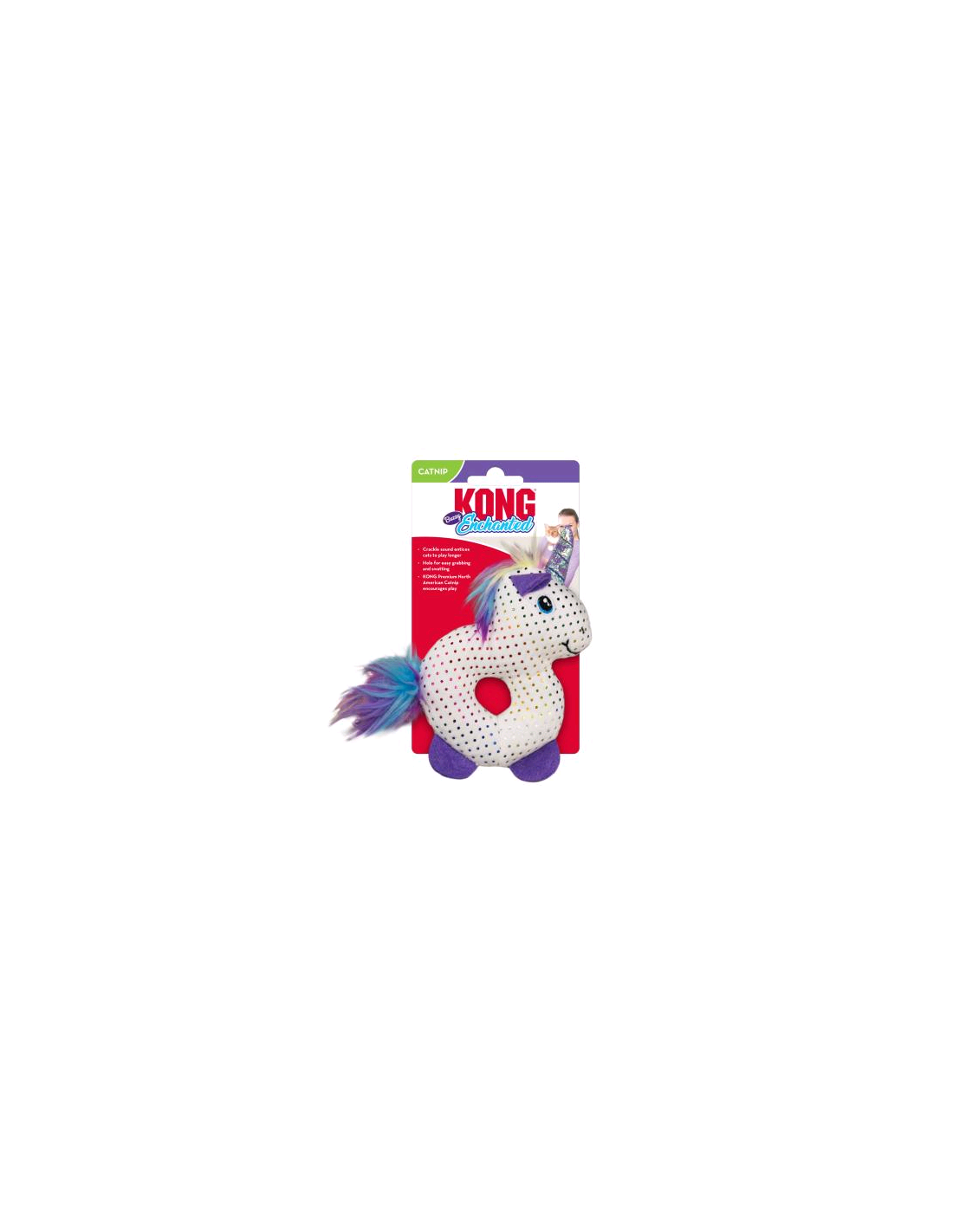 Con brillantes puntos iridiscentes y un sonido irresistible y arrugado, KONG Encantado lanza un hechizo juguetón sobre tu gato, atrayéndolo a combates de juego saludable y activo para reinar sobre los reinos mágicos de criaturas míticas en un mundo con olor a catnip.